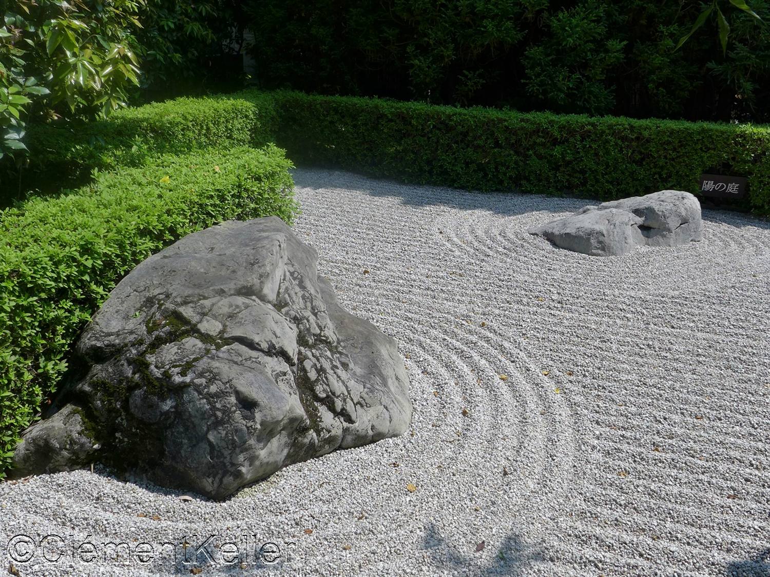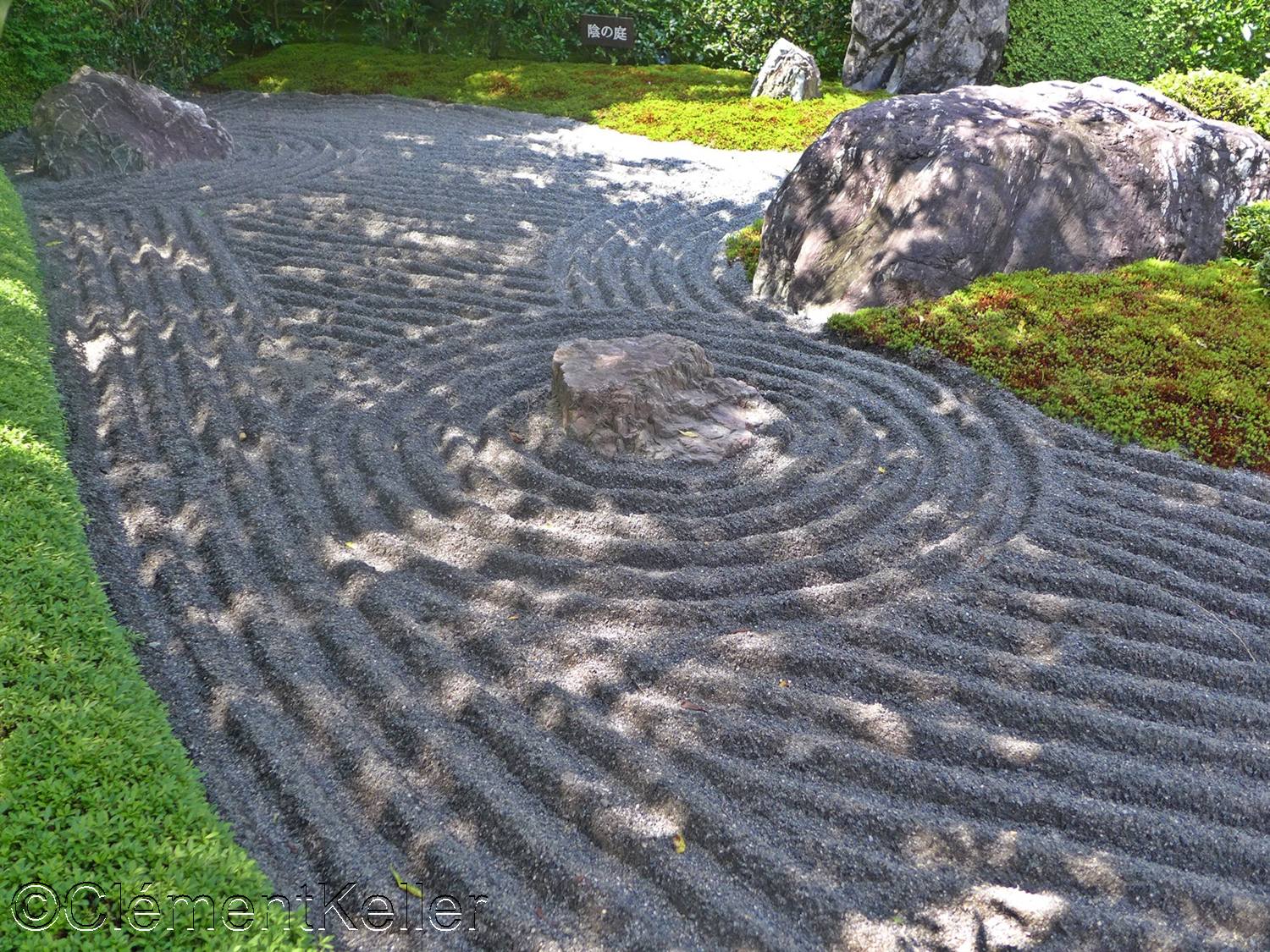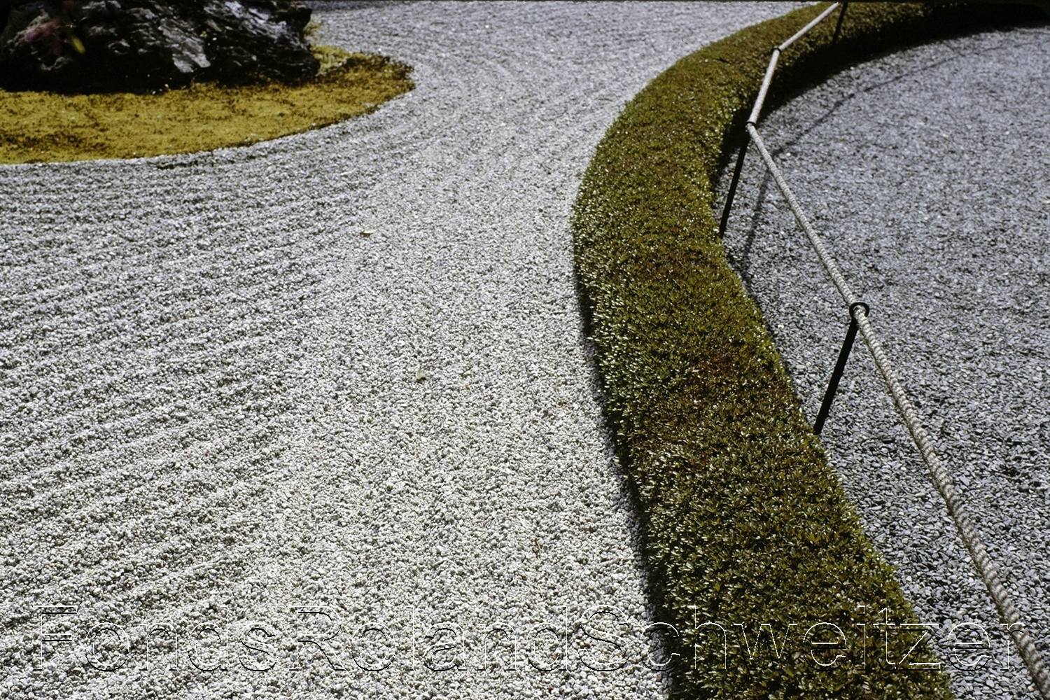 Dans la continuité du parcours apparaît le jardin du Yin et du Yang, « In’yō-no-niwa » 陰陽の庭. Cette composition, d’auteur incertain, remonte probablement à la seconde moitié du XXᵉ siècle dans le contexte des réaménagements contemporains du temple. Elle s’inspire explicitement du principe cosmologique du yin et du yang « in’yō » 陰陽, fondé sur la complémentarité des forces opposées. Le dispositif repose sur deux zones contrastées : l’une sombre, constituée de gravier foncé et de plantations plus denses, et l’autre claire où dominent sable clair et surfaces ouvertes. Les lignes courbes et les masses végétales y créent un jeu d’équilibre dynamique, traduisant une interprétation moderne d’un concept cosmologique traditionnel tout en conservant le vocabulaire minimaliste des jardins zen.