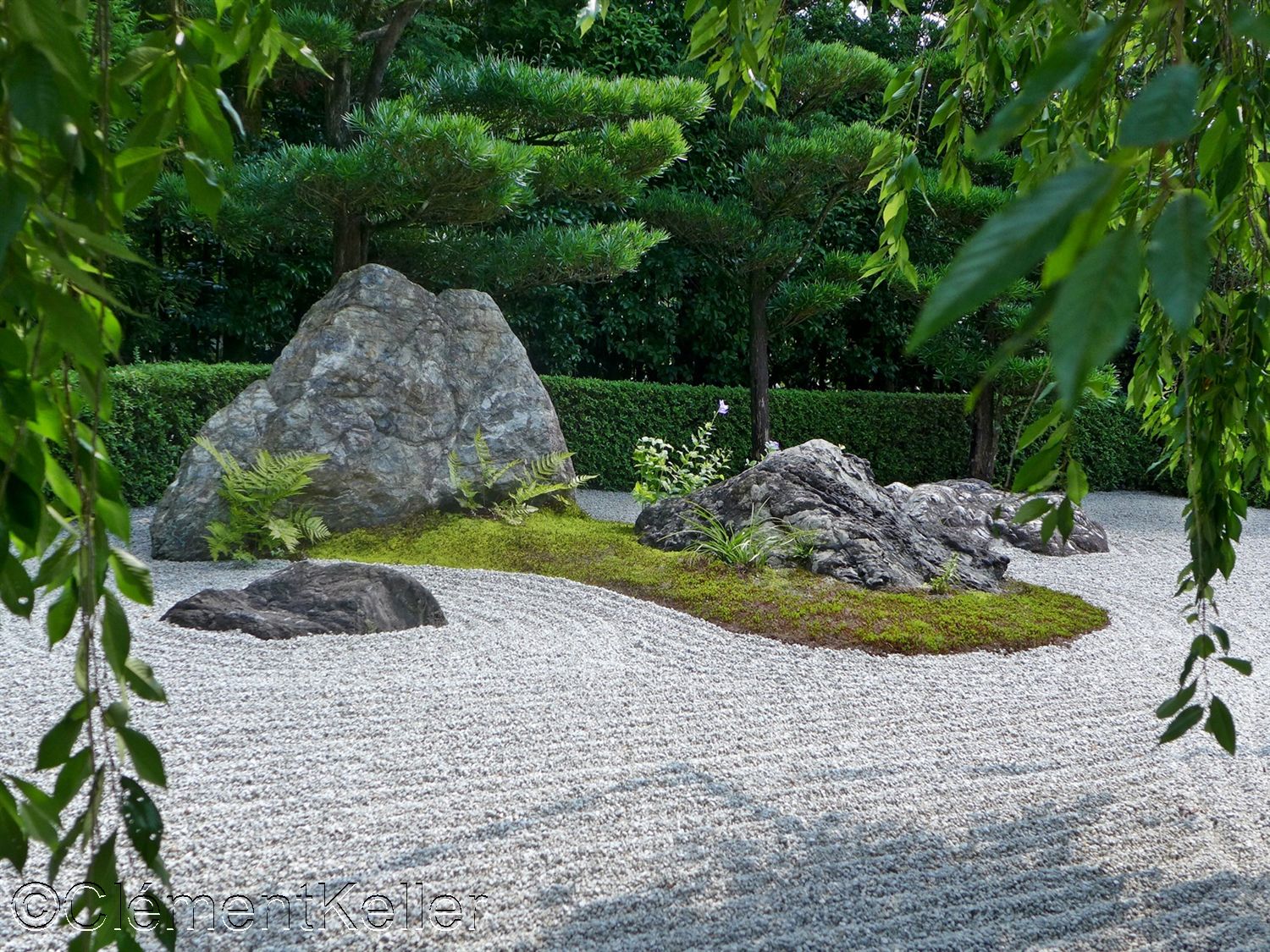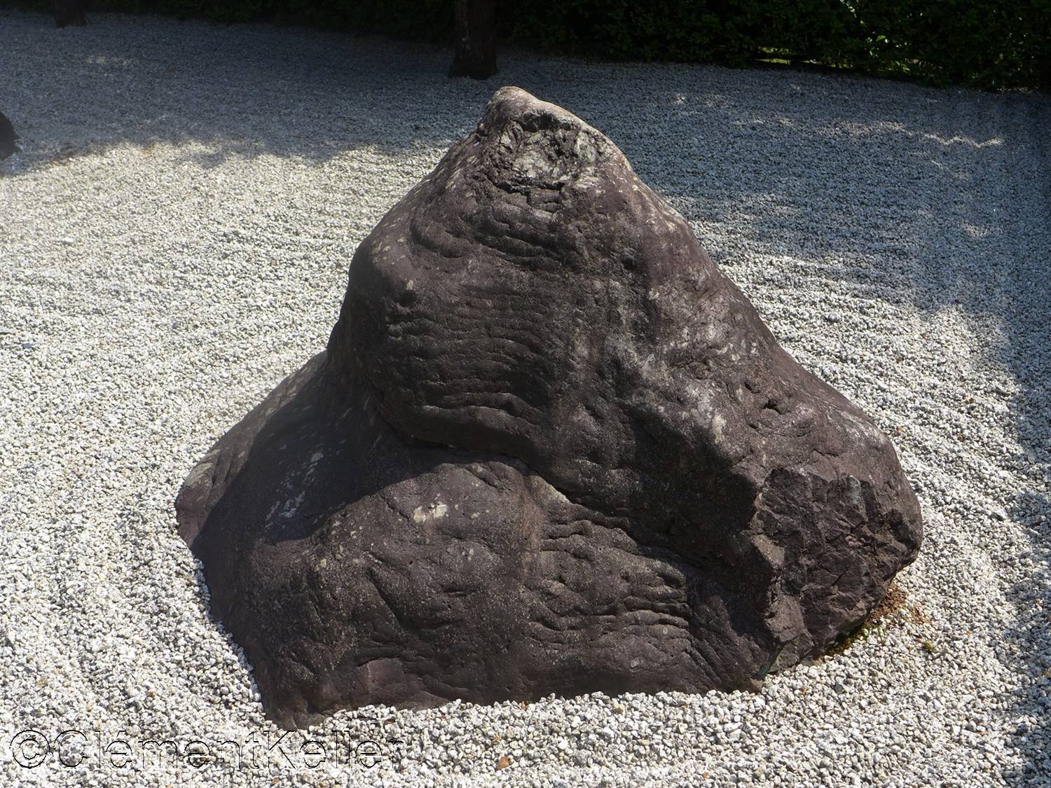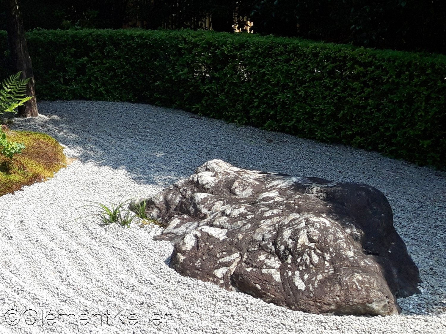 Dans la continuité du parcours apparaît le jardin du Yin et du Yang, « In’yō-no-niwa » 陰陽の庭. Cette composition, d’auteur incertain, remonte probablement à la seconde moitié du XXᵉ siècle dans le contexte des réaménagements contemporains du temple. Elle s’inspire explicitement du principe cosmologique du yin et du yang « in’yō » 陰陽, fondé sur la complémentarité des forces opposées. Le dispositif repose sur deux zones contrastées : l’une sombre, constituée de gravier foncé et de plantations plus denses, et l’autre claire où dominent sable clair et surfaces ouvertes. Les lignes courbes et les masses végétales y créent un jeu d’équilibre dynamique, traduisant une interprétation moderne d’un concept cosmologique traditionnel tout en conservant le vocabulaire minimaliste des jardins zen.