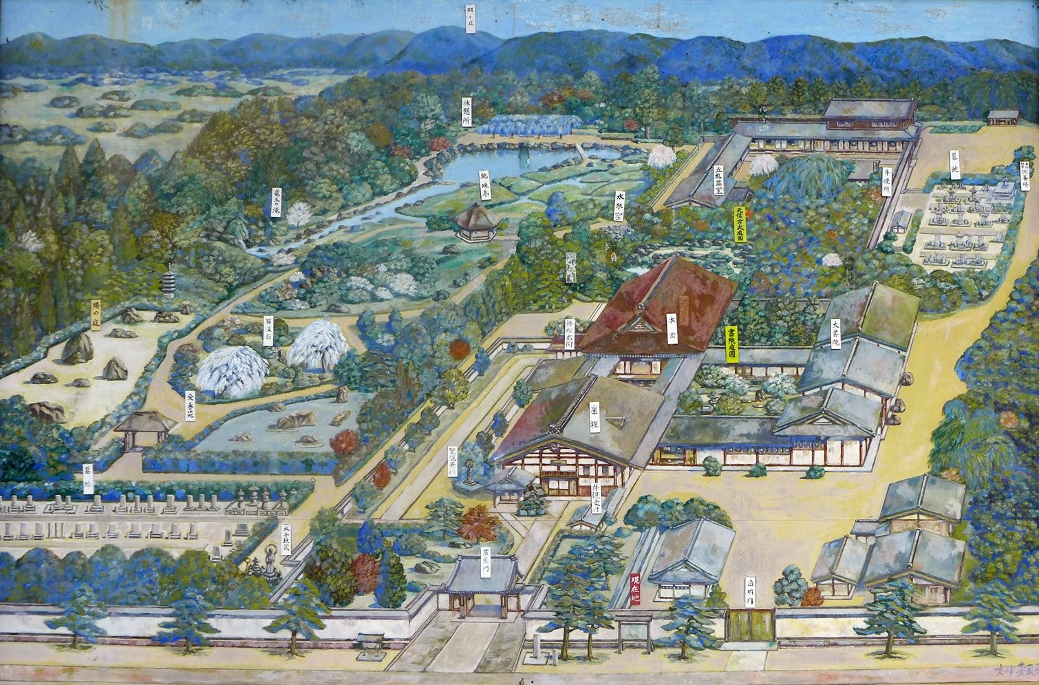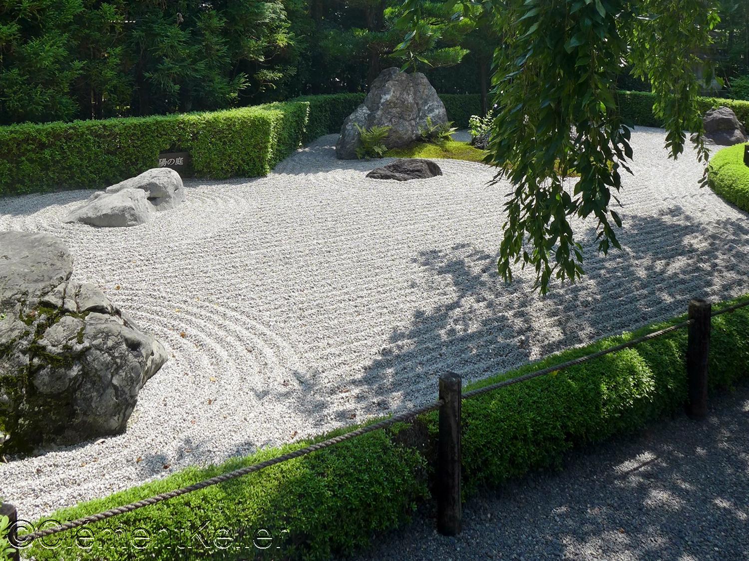 Il possède un ensemble de jardins particulièrement remarquable car il juxtapose des créations de périodes très différentes. Trois compositions principales structurent aujourd’hui le parcours : le jardin de Motonobu, le jardin du Yin et du Yang et le jardin moderne Yokō-en.