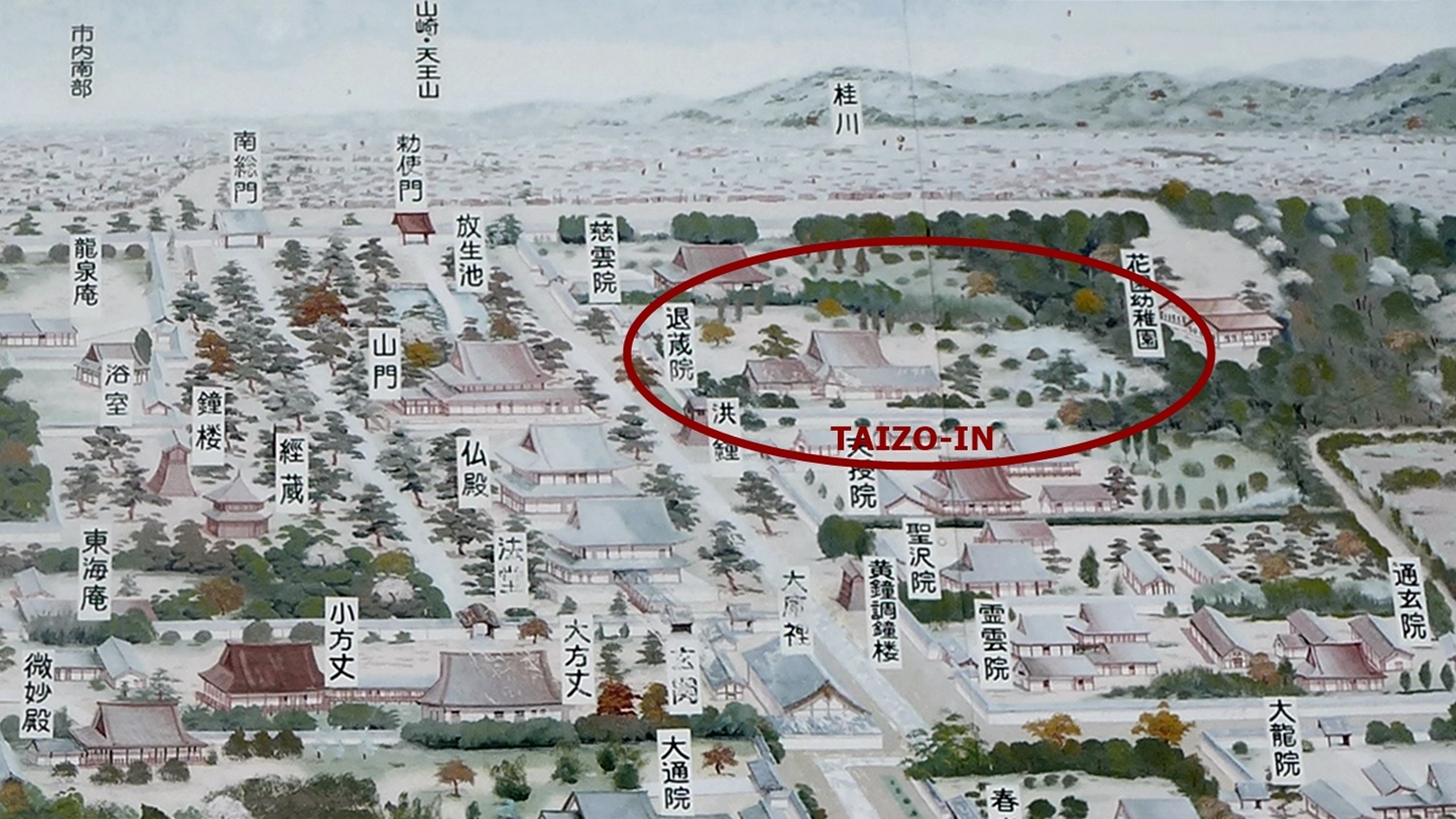 Perspective de Myōshin-ji en direction du Sud et localisation de Taizō-in.