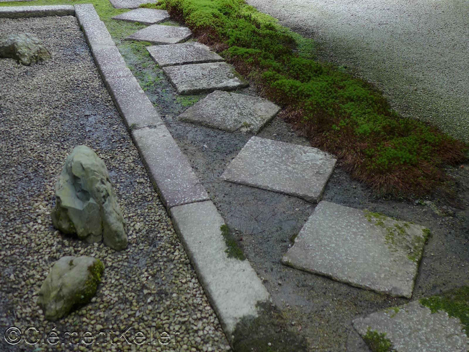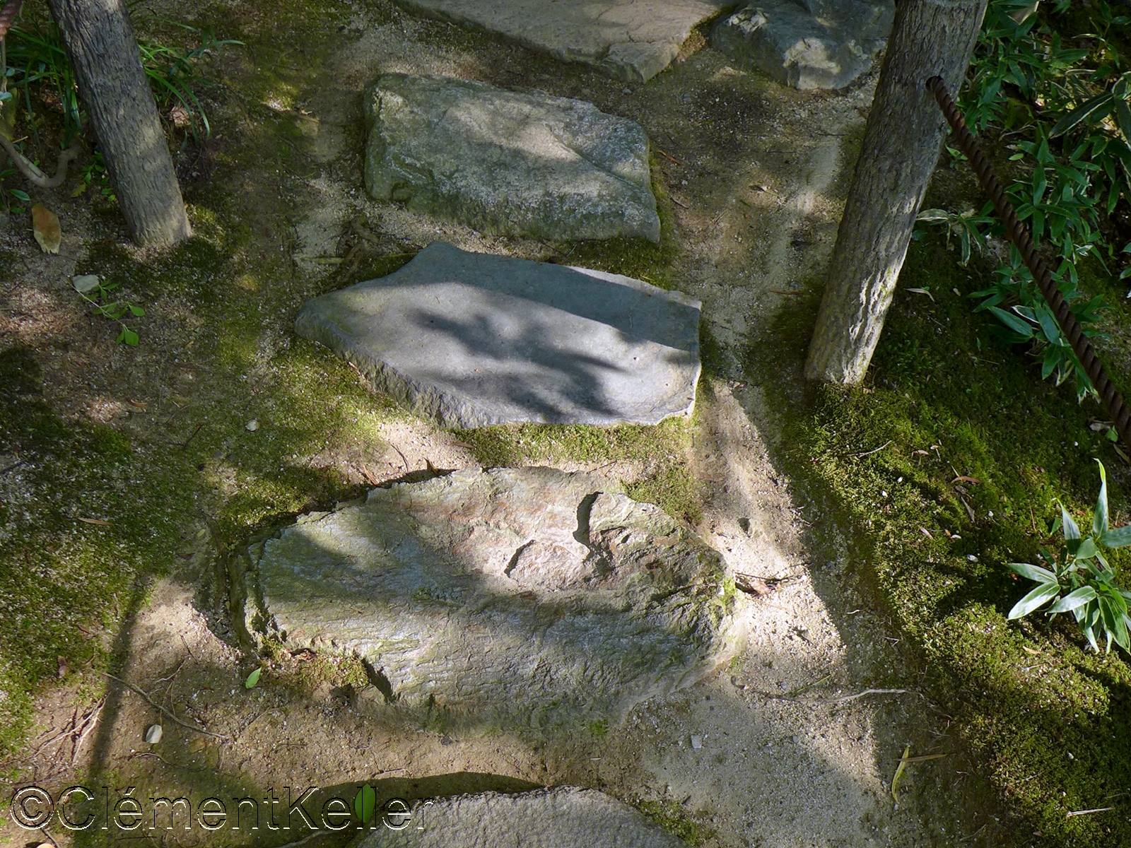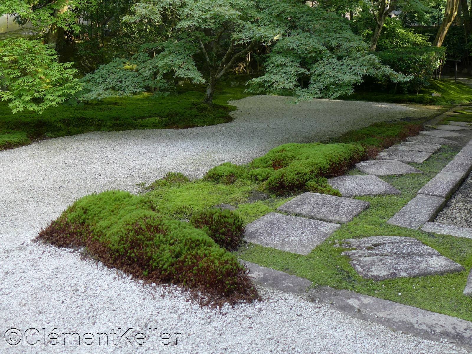 Le premier, situé à l’est du « hōjō », est un jardin sec « karesansui » 枯山水. Il se distingue par une composition unique due aux allées de dalles carrées. Disposées selon des lignes droites et des figures inclinées à 45 degrés », elles dessinent un pavage géométrique évoquant un motif en écailles de poisson « uroko-shiki ». Cet agencement, attribué au goût raffiné de Kobori Enshū 小堀遠州 (1579-1647), maître de thé, architecte et paysagiste, reflète une esthétique de la mesure et de la simplicité. Le sable blanc représente un large fleuve, traversé de petites îles de mousse et de pins noirs. De l’autre côté, une colline moussue forme un contrepoint, instaurant un dialogue subtil entre rigueur minérale et vitalité végétale.