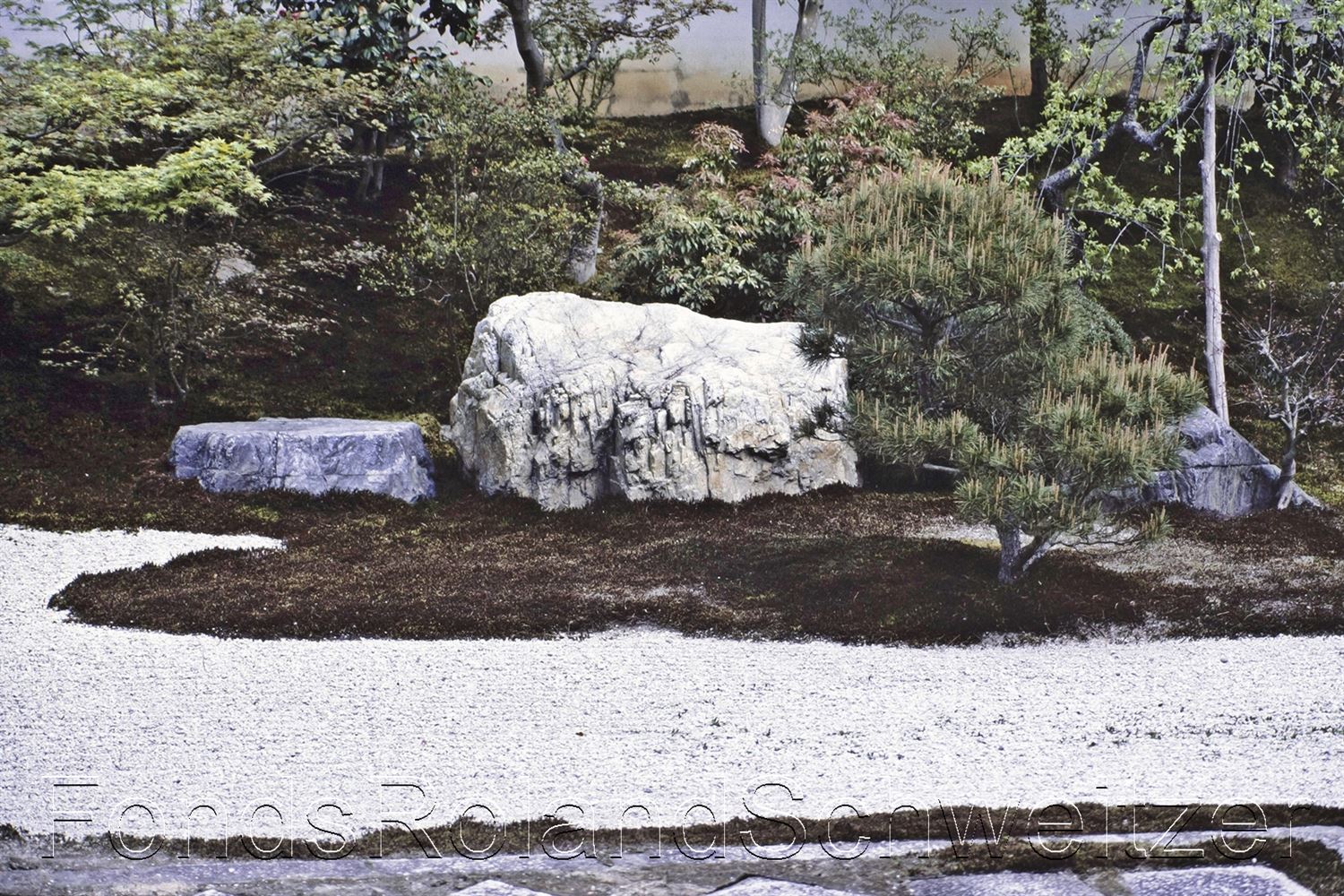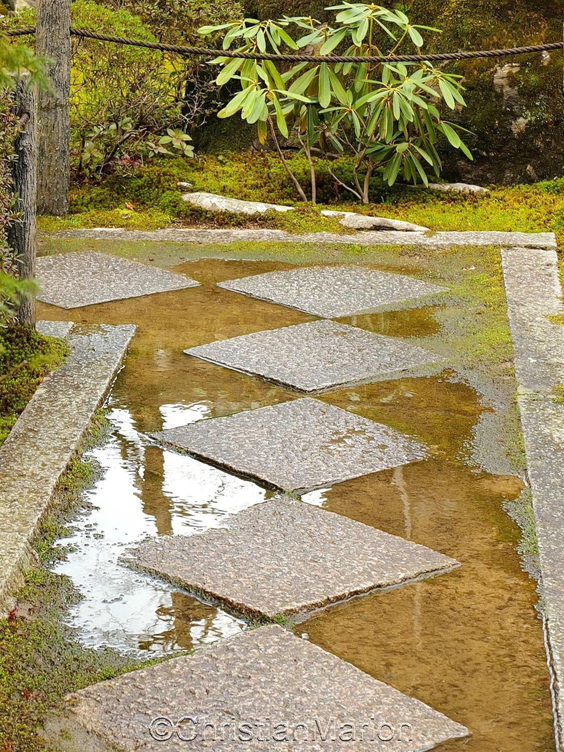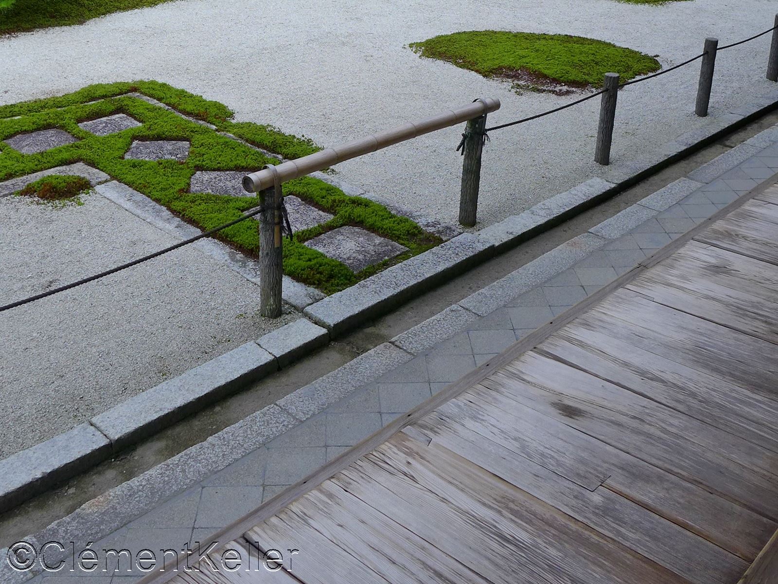 Le premier, situé à l’est du « hōjō », est un jardin sec « karesansui » 枯山水. Il se distingue par une composition unique due aux allées de dalles carrées. Disposées selon des lignes droites et des figures inclinées à 45 degrés », elles dessinent un pavage géométrique évoquant un motif en écailles de poisson « uroko-shiki ». Cet agencement, attribué au goût raffiné de Kobori Enshū 小堀遠州 (1579-1647), maître de thé, architecte et paysagiste, reflète une esthétique de la mesure et de la simplicité. Le sable blanc représente un large fleuve, traversé de petites îles de mousse et de pins noirs. De l’autre côté, une colline moussue forme un contrepoint, instaurant un dialogue subtil entre rigueur minérale et vitalité végétale.