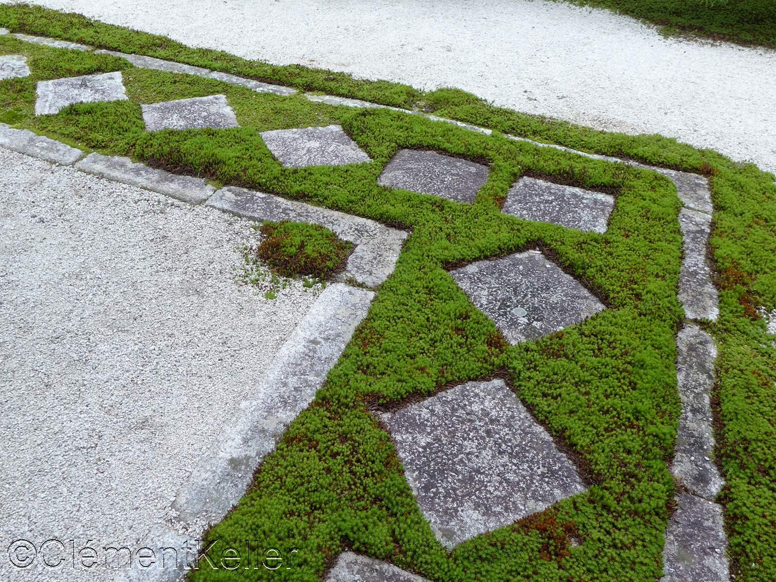 Le jardin sec avec ses dalles orientées à 45 degrés.
