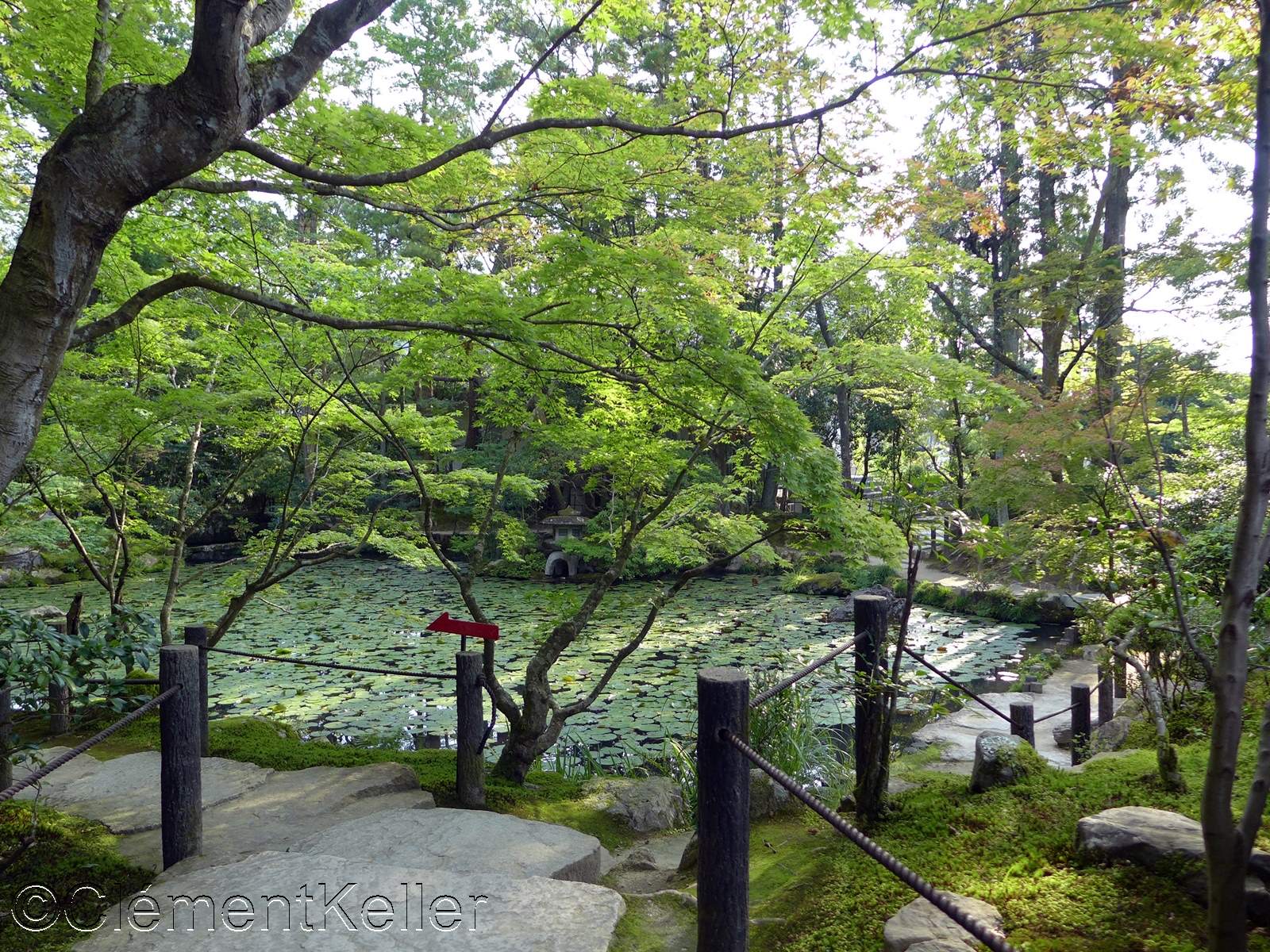Le second espace situé au Sud du « shoin » est un jardin de promenade autour d’un étang « chisen teien » 池泉庭園. Son aménagement est plus ancien et présente des caractéristiques de l’époque de Kamakura. On y trouve un étang avec une île symbolique de Horai, reliée par un pont de pierres et des pas japonais. Sur une colline se dressent trois rochers qui figurent la triade bouddhique « sansonseki » 三尊石, tandis qu’à la base s’organise un puissant groupe de blocs arrondis. Un pont en zigzag « hachihashi » 八ッ橋 traverse le bassin couvert de plantes aquatiques. Entre les deux plans d’eau s’avance une fine presqu’île « dejima » 出島, héritage des découpages de terrain médiévaux. Une cascade, « chute détachée » « hanare-ochi no taki » 離れ落ちの滝 ajoute une note de fraîcheur et de mystère.