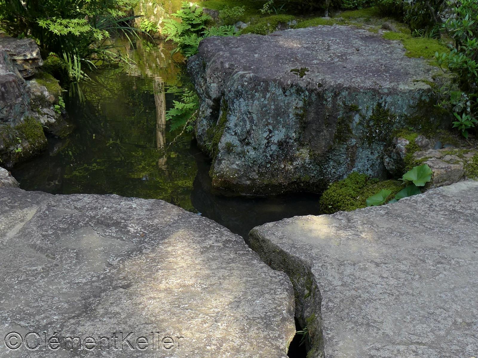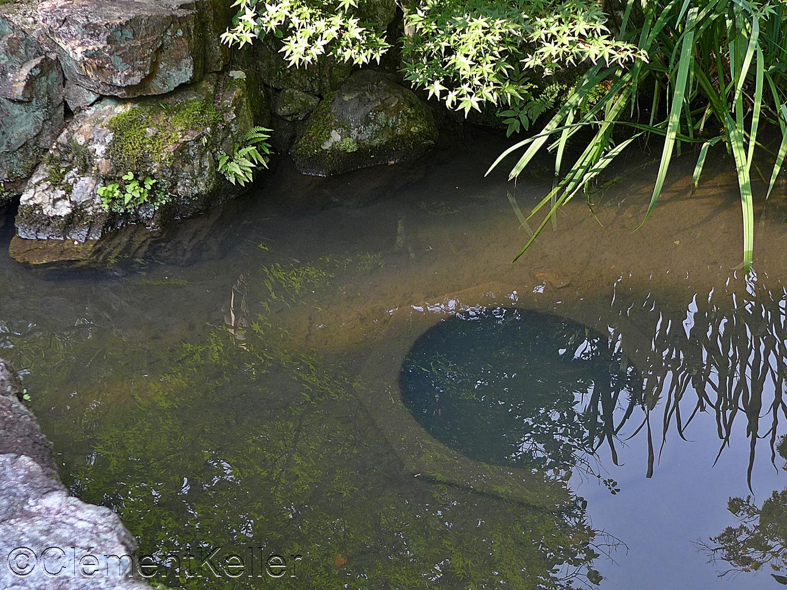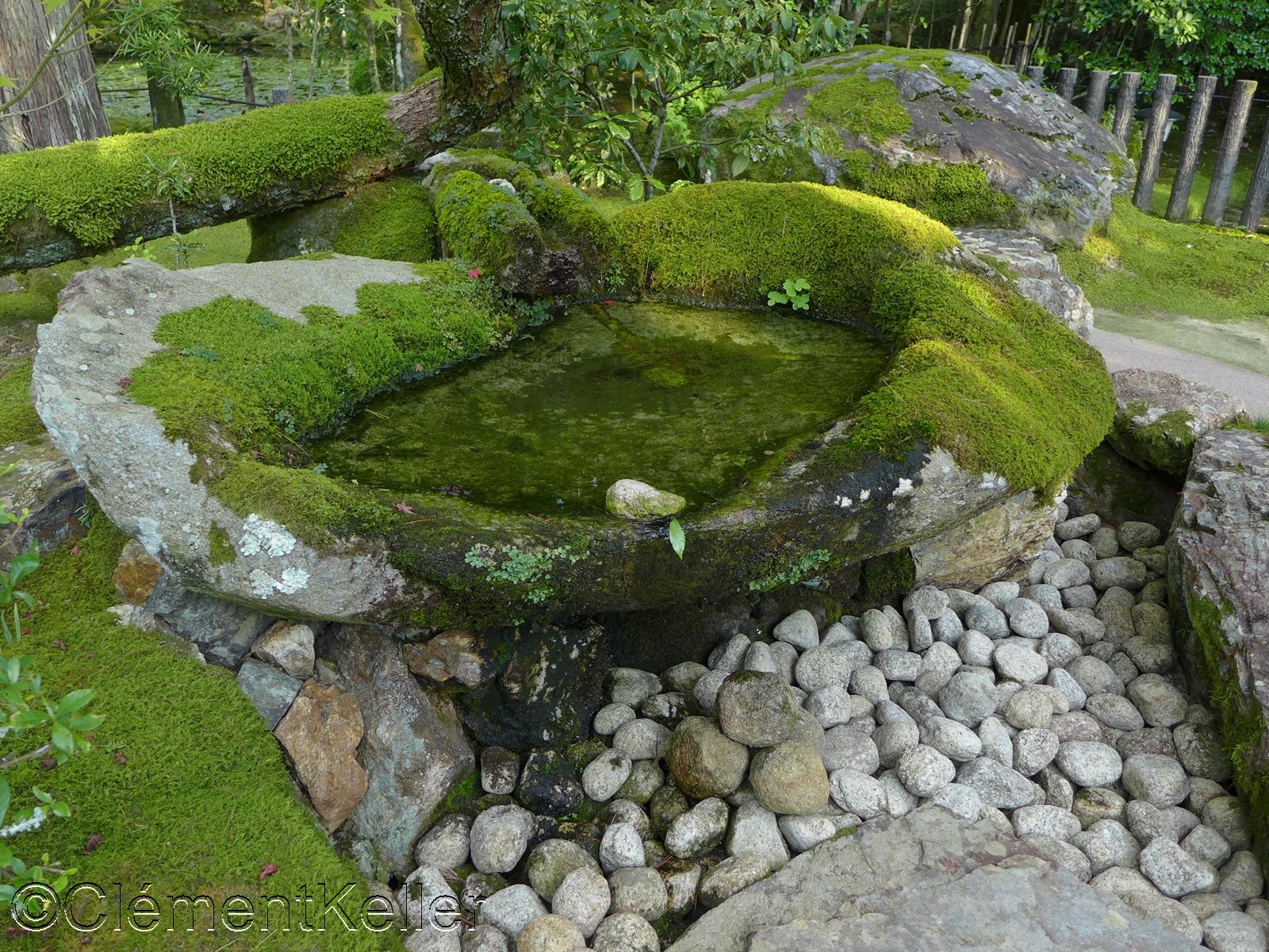 A l’Ouest de l’étang, est implantée une grande bassine « tsukubai » 蹲居 en pierre moussue.
