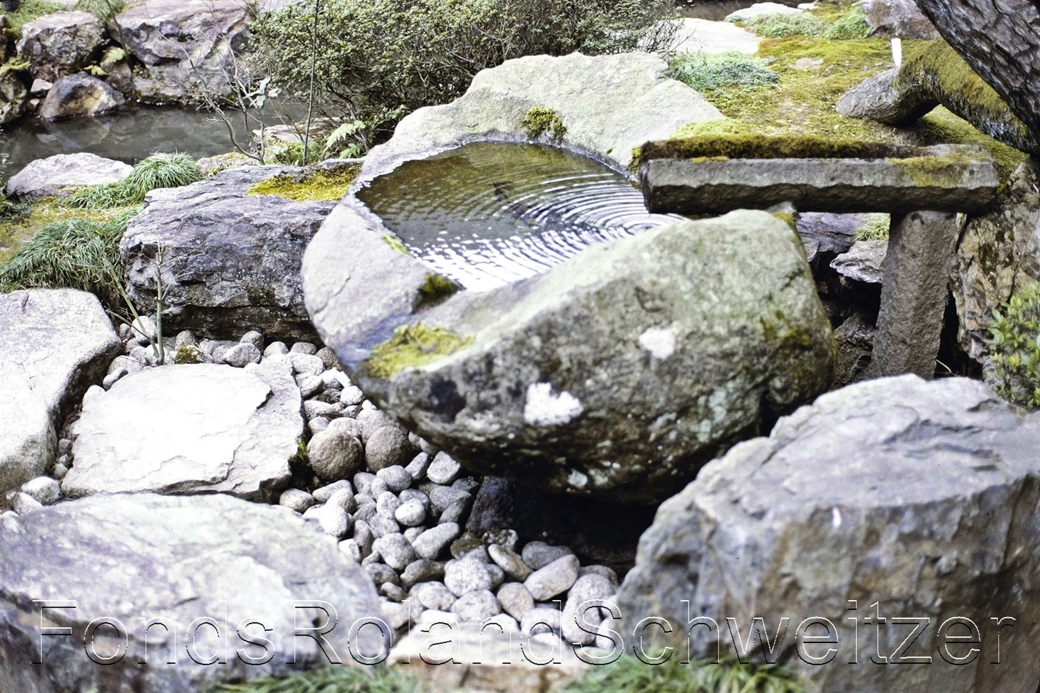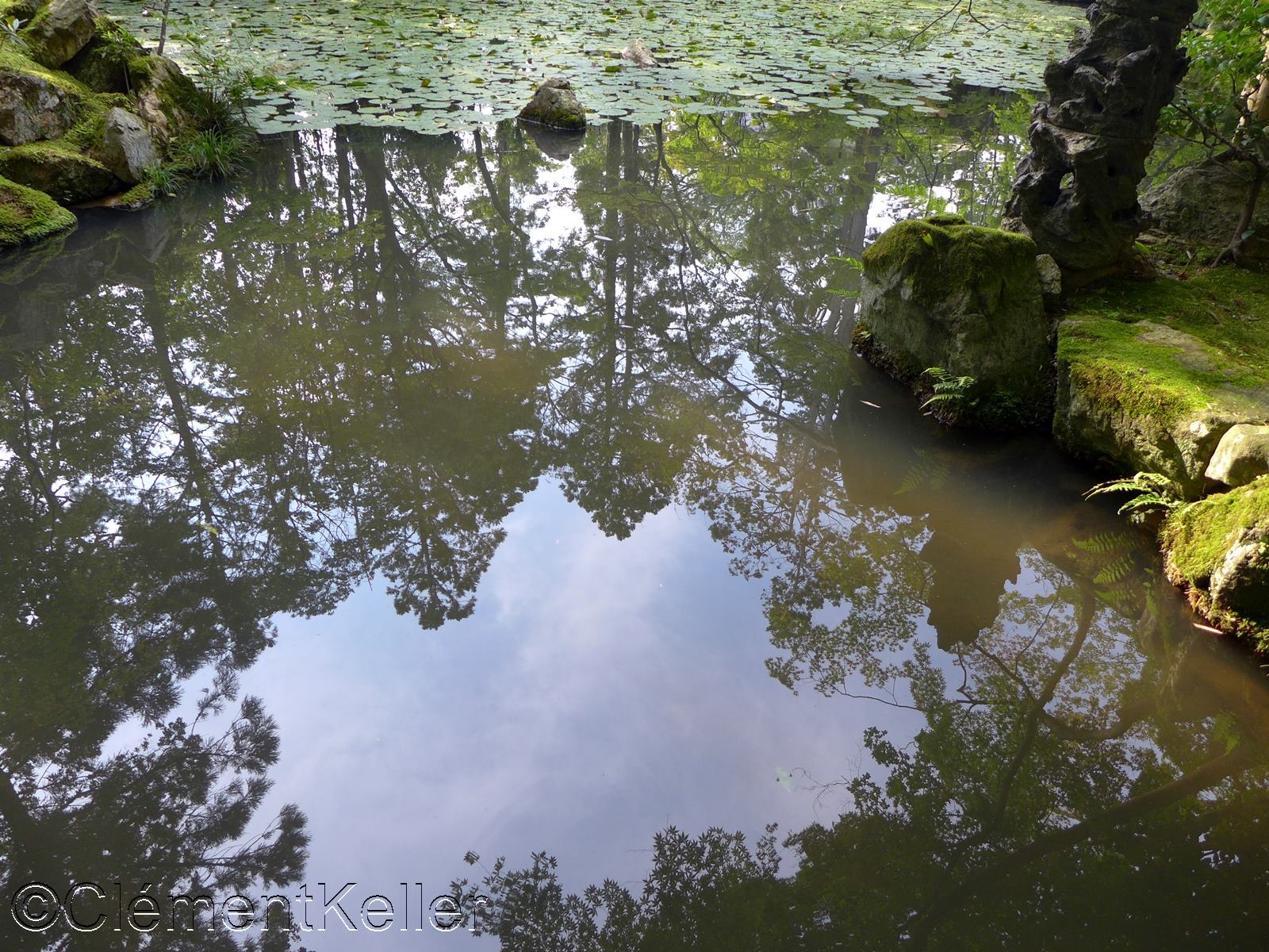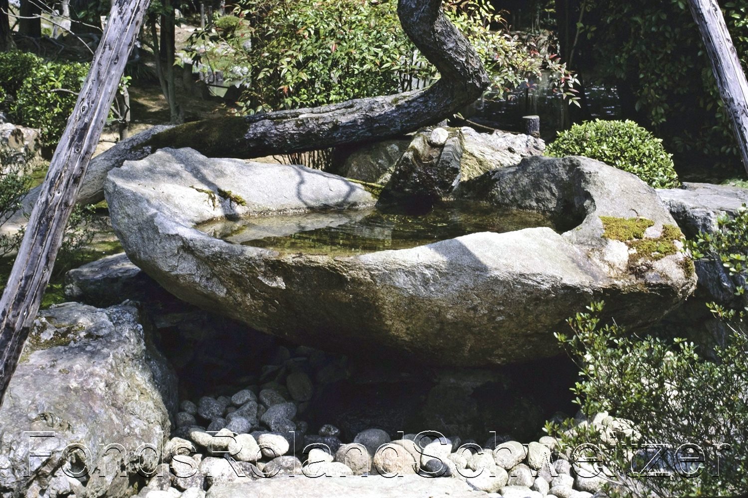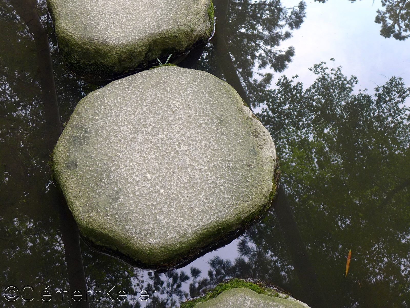 A l’Ouest de l’étang, est implantée une grande bassine « tsukubai » 蹲居 en pierre moussue.